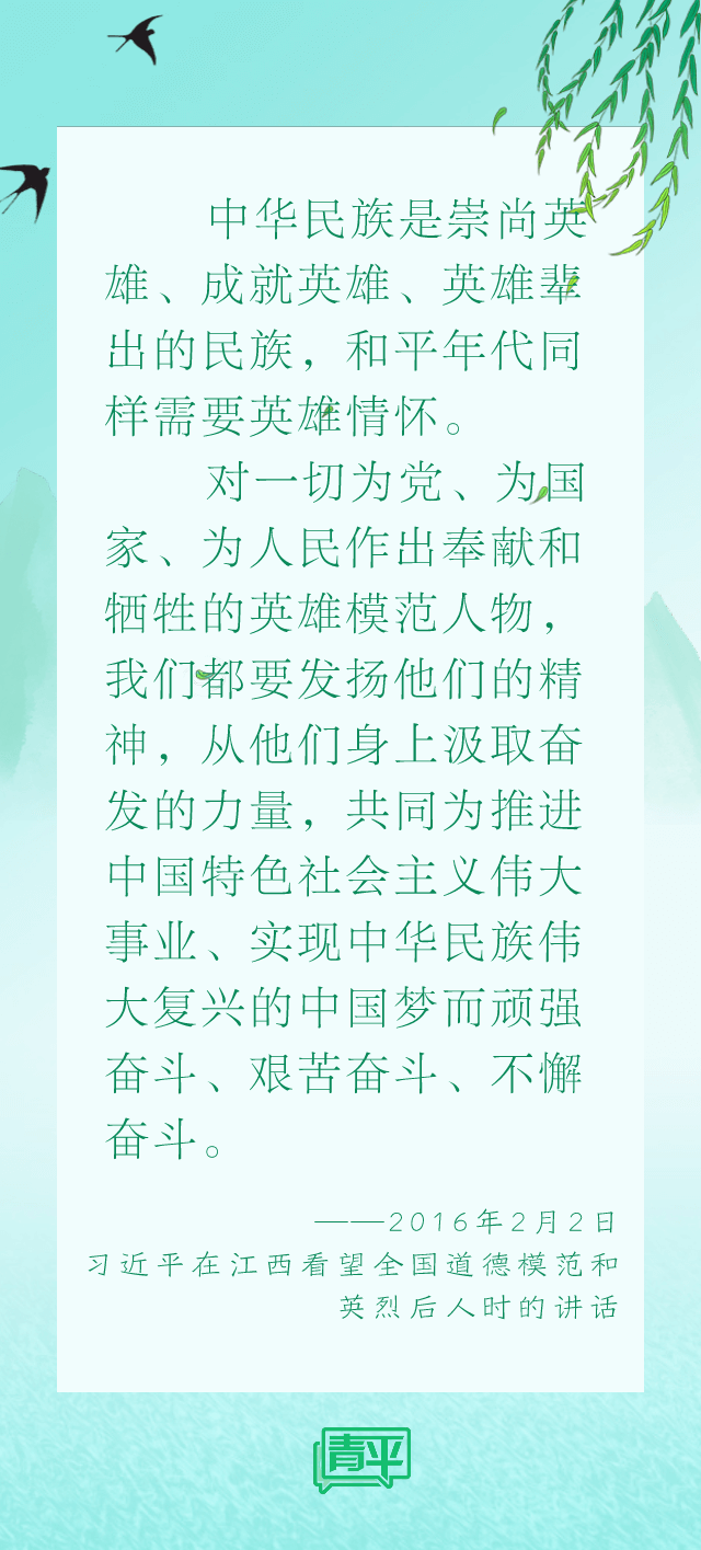 黨的十八大以來,習近平總書記曾在多個場合多次講述英雄故事、緬懷英雄先烈、謳歌民族英雄。今日清明,讓我們重溫總書記贊美英雄、緬懷英烈的話語,共同銘記歷史,祭奠英烈,傳承“紅色基因”。