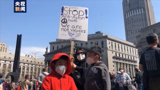 有不少抗議者高舉“停止仇恨亞裔”“停止歧視”“仇恨才是病毒”等標語,表達訴求。有抗議者還帶著子女老人一同前往,表達對活動的支持。