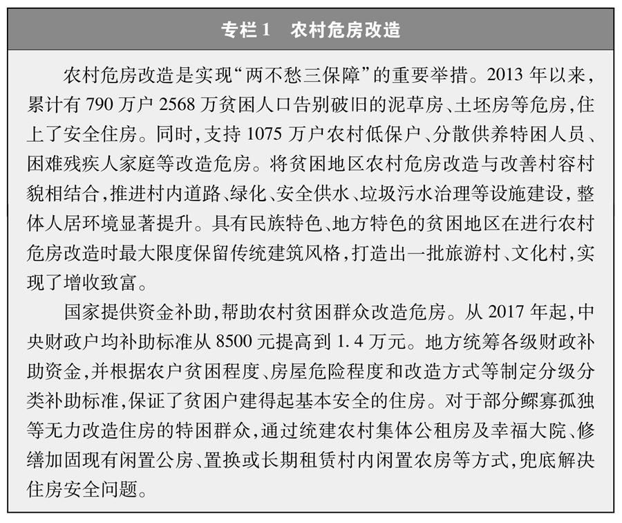 “兩不愁三保障”全面實現(xiàn)。脫貧攻堅普查⑧顯示,貧困戶全面實現(xiàn)不愁吃、不愁穿,平時吃得飽且能適當(dāng)吃好,一年四季都有應(yīng)季的換洗衣物和御寒被褥。貧困人口受教育的機會顯著增多、水平持續(xù)提高,農(nóng)村貧困家庭子女義務(wù)教育階段輟學(xué)問題實現(xiàn)動態(tài)清零,2020年貧困縣九年義務(wù)教育鞏固率達到94.8%。持續(xù)完善縣鄉(xiāng)村三級醫(yī)療衛(wèi)生服務(wù)體系,把貧困人口全部納入基本醫(yī)療保險、大病保險、醫(yī)療救助三重制度保障范圍,實施大病集中救治、慢病簽約管理、重病兜底保障等措施,99.9%以上的貧困人口參加基本醫(yī)療保險,全面實現(xiàn)貧困人口看病有地方、有醫(yī)生、有醫(yī)療保險制度保障,看病難、看病貴問題有效解決。實施農(nóng)村危房改造,貧困人口全面實現(xiàn)住房安全有保障(專欄1)。實施農(nóng)村飲水安全和鞏固提升工程,累計解決2889萬貧困人口的飲水安全問題,飲用水量和水質(zhì)全部達標(biāo),3.82億農(nóng)村人口受益;貧困地區(qū)自來水普及率從2015年的70%提高到2020年的83%。