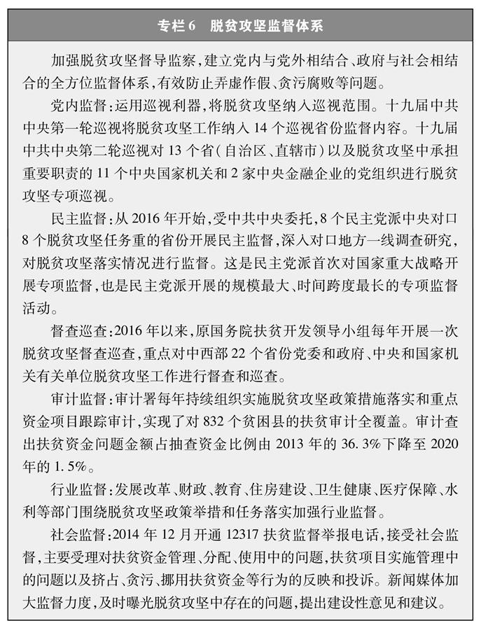 脫貧攻堅涉及面廣、要素繁多、極其復(fù)雜,需要強有力的組織領(lǐng)導(dǎo)和貫徹執(zhí)行。充分發(fā)揮黨的政治優(yōu)勢、組織優(yōu)勢,建立中央統(tǒng)籌、省負總責(zé)、市縣抓落實的脫貧攻堅管理體制和片為重點、工作到村、扶貧到戶的工作機制,構(gòu)建起橫向到邊、縱向到底的工作體系。各級黨委充分發(fā)揮總攬全局、協(xié)調(diào)各方的作用,執(zhí)行脫貧攻堅一把手負責(zé)制,中西部22個省份黨政主要負責(zé)同志向中央簽署責(zé)任書、立下軍令狀,省市縣鄉(xiāng)村五級書記一起抓。脫貧攻堅期內(nèi),貧困縣黨委政府正職保持穩(wěn)定。有脫貧任務(wù)的地區(qū),倒排工期、落實責(zé)任,抓緊施工、強力推進。脫貧攻堅任務(wù)重的地區(qū),把脫貧攻堅作為頭等大事和第一民生工程,以脫貧攻堅統(tǒng)攬經(jīng)濟社會發(fā)展全局。實行最嚴格的考核評估和監(jiān)督檢查,組織脫貧攻堅專項巡視,開展扶貧領(lǐng)域腐敗和作風(fēng)問題專項治理(專欄5),加強脫貧攻堅督導(dǎo)和監(jiān)察(專欄6),確保扶貧工作務(wù)實、脫貧過程扎實、脫貧結(jié)果真實,使脫貧攻堅成果經(jīng)得起實踐和歷史檢驗。建立健全干部擔(dān)當(dāng)作為的激勵和保護機制,加大關(guān)心關(guān)愛干部力度,樹立正確用人導(dǎo)向,引導(dǎo)廣大干部在決勝脫貧攻堅中奮發(fā)有為、履職盡責(zé)。加強基層扶貧隊伍建設(shè),普遍建立干部駐村幫扶工作隊制度,按照因村派人、精準(zhǔn)選派的原則,選派政治素質(zhì)好、工作能力強、作風(fēng)實的干部駐村扶貧。廣大駐村干部牢記使命、不負重托,心系貧困群眾,扎根基層扶貧一線,傾心傾力幫助貧困群眾找出路、謀發(fā)展、早脫貧。從2013年開始向貧困村選派第一書記和駐村工作隊,到2015年,實現(xiàn)每個貧困村都有駐村工作隊、每個貧困戶都有幫扶責(zé)任人。截至2020年底,全國累計選派25.5萬個駐村工作隊、300多萬名第一書記和駐村干部,同近200萬名鄉(xiāng)鎮(zhèn)干部和數(shù)百萬村干部一道奮戰(zhàn)在扶貧一線。