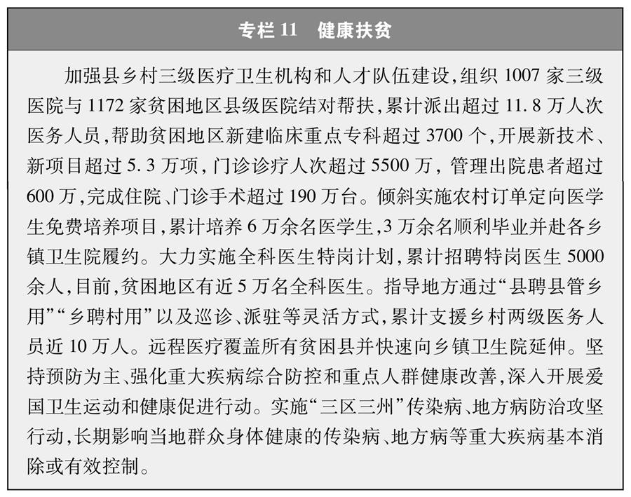 中國還結(jié)合實際、因地制宜,采取其他多渠道多元化扶貧措施。大力推進就業(yè)扶貧,通過免費開展職業(yè)技能培訓(xùn)、東西部扶貧協(xié)作勞務(wù)輸出、扶貧車間和扶貧龍頭企業(yè)吸納、返鄉(xiāng)創(chuàng)業(yè)帶動、扶貧公益性崗位安置等形式,支持有勞動能力的貧困人口在本地或外出務(wù)工、創(chuàng)業(yè),貧困勞動力務(wù)工規(guī)模從2015年的1227萬人增加到2020年的3243萬人。開展健康扶貧工程,把健康扶貧作為脫貧攻堅重要舉措,防止因病致貧返貧(專欄11)。深入實施網(wǎng)絡(luò)扶貧工程,支持貧困地區(qū)特別是“三區(qū)三州”等深度貧困地區(qū),完善網(wǎng)絡(luò)覆蓋,推進“互聯(lián)網(wǎng)+”扶貧模式。實施資產(chǎn)收益扶貧,把中央財政專項扶貧資金和其他涉農(nóng)資金投入設(shè)施農(nóng)業(yè)、光伏、鄉(xiāng)村旅游等項目形成的資產(chǎn),折股量化到貧困村,推動產(chǎn)業(yè)發(fā)展,增加群眾收入,破解村集體經(jīng)濟收入難題。2020年新冠肺炎疫情發(fā)生后,中國采取一系列應(yīng)對疫情的幫扶舉措,加大就業(yè)穩(wěn)崗力度,開展消費扶貧行動,有效克服了新冠肺炎疫情影響。