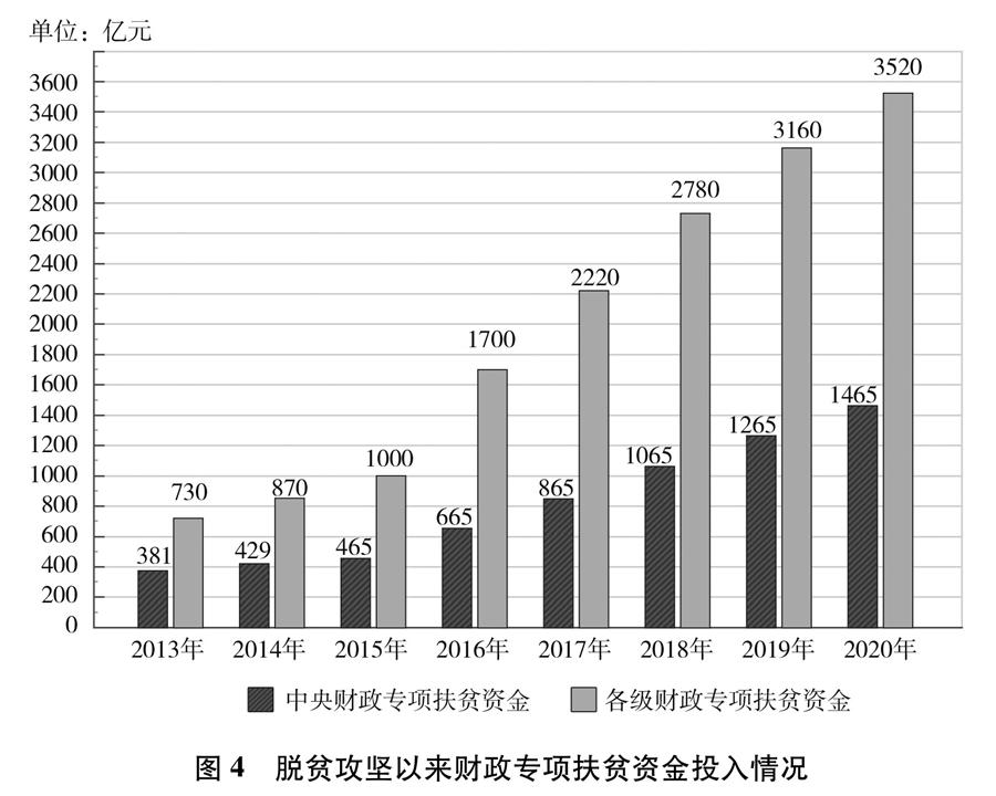 貧困地區(qū)發(fā)展條件差,貧困人口自我發(fā)展能力弱,消除貧困僅僅依靠個體、區(qū)域、民間等力量遠遠不夠,必須作為執(zhí)政黨和國家的責(zé)任,上升為國家意志、國家戰(zhàn)略、國家行動。中國共產(chǎn)黨始終把消除貧困作為定國安邦的重要任務(wù),制定實施一個時期黨的路線方針政策、提出國家中長期發(fā)展規(guī)劃建議,都把減貧作為重要內(nèi)容,從國家層面部署,運用國家力量推進。幾代中國共產(chǎn)黨人,錨定一個目標(biāo),一茬接著一茬干。中共十八大以來,中國共產(chǎn)黨把脫貧攻堅擺在治國理政的突出位置,加強黨的集中統(tǒng)一領(lǐng)導(dǎo),統(tǒng)籌謀劃、強力推進。從黨的領(lǐng)袖到廣大黨員干部,情系貧困群眾、心懷減貧大業(yè),全黨目標(biāo)一致、上下同心。加強頂層設(shè)計和戰(zhàn)略規(guī)劃,制定印發(fā)《關(guān)于打贏脫貧攻堅戰(zhàn)的決定》《關(guān)于打贏脫貧攻堅戰(zhàn)三年行動的指導(dǎo)意見》等政策文件,明確目標(biāo)、路徑和具體措施并一以貫之抓下去。各級財政不斷加大投入力度(圖4),構(gòu)建多元資金投入體系(專欄12),為減貧事業(yè)發(fā)展提供資金保障。發(fā)揮社會主義制度集中力量辦大事的優(yōu)勢,廣泛動員各方力量積極參與。建立脫貧攻堅責(zé)任體系、政策體系、組織體系、投入體系、動員體系、監(jiān)督體系、考核評估體系等制度體系,為脫貧攻堅順利推進提供了有力支撐。