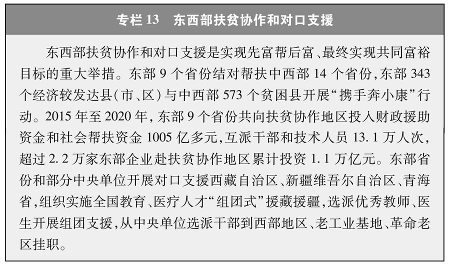 扶貧減貧是艱巨復(fù)雜的系統(tǒng)工程,需要調(diào)動各方積極參與。為打贏脫貧攻堅戰(zhàn),中國共產(chǎn)黨依托嚴密組織體系和高效運行機制,廣泛有效動員和凝聚各方力量,構(gòu)建政府、社會、市場協(xié)同推進,專項扶貧、行業(yè)扶貧、社會扶貧互為補充的大扶貧格局,形成跨地區(qū)、跨部門、跨單位、全社會共同參與的多元主體的社會扶貧體系。加強東西部扶貧協(xié)作和對口支援(專欄13),推動省市縣各層面幫扶,促進人才、資金、技術(shù)向貧困地區(qū)流動,實現(xiàn)優(yōu)勢互補,縮小區(qū)域差距。積極開展定點扶貧,組織各級黨政機關(guān)、人民團體、國有企事業(yè)單位和軍隊幫扶貧困縣或貧困村(專欄14)。各民主黨派、工商聯(lián)和無黨派人士充分發(fā)揮各自優(yōu)勢,為打贏脫貧攻堅戰(zhàn)獻智獻力。積極推動各行各業(yè)發(fā)揮專業(yè)優(yōu)勢,開展產(chǎn)業(yè)扶貧、科技扶貧、教育扶貧、文化扶貧、健康扶貧、消費扶貧。廣泛動員民營企業(yè)參與扶貧開發(fā),引導(dǎo)市場開發(fā)能力強的主體進入資源開發(fā)潛力大的地區(qū),實現(xiàn)互惠互利、共同發(fā)展(專欄15)。廣泛動員社會組織、公民個人積極參與脫貧攻堅,開展扶貧公益活動。設(shè)立國家扶貧日,建立脫貧攻堅國家榮譽制度,表彰脫貧攻堅先進典型,營造了人人愿為、人人可為、人人能為的社會幫扶氛圍。