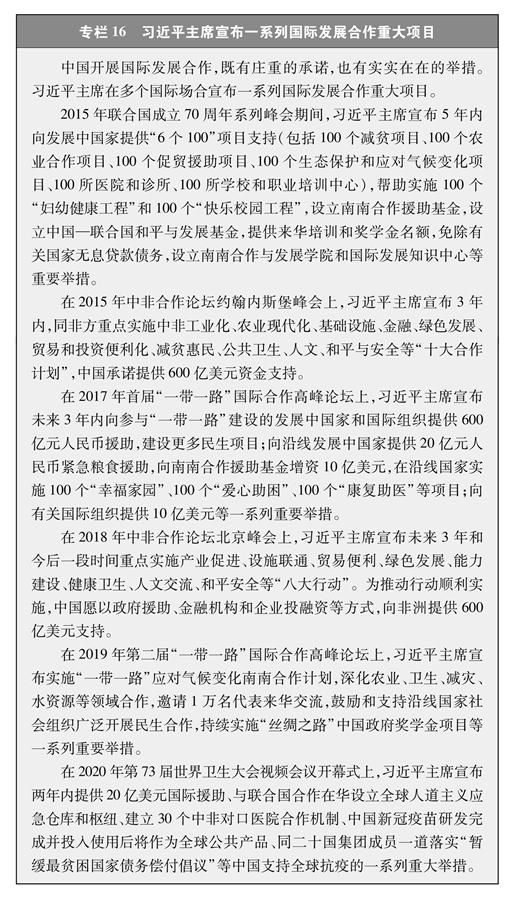支持廣大發(fā)展中國家減貧發(fā)展。新中國成立伊始,在國家百廢待興、財力緊張的情況下,即向有關(guān)國家提供援助,為發(fā)展中國家爭取民族獨立和解放、促進經(jīng)濟社會發(fā)展提供了支持。改革開放后,中國對外援助內(nèi)容更加豐富、形式更加多樣,促進了中國與其他發(fā)展中國家的共同發(fā)展。進入新時代,中國擔(dān)負大國責(zé)任,推動對外援助向國際發(fā)展合作轉(zhuǎn)型升級,為破解全球發(fā)展難題、落實聯(lián)合國2030年可持續(xù)發(fā)展議程提出中國方案、貢獻中國智慧、注入中國力量。習(xí)近平主席在多個國際重大場合宣布中國開展國際發(fā)展合作的一系列務(wù)實舉措,已按期落實或正在按照進度有序推進(專欄16)。中國發(fā)起共建“一帶一路”倡議,推動更大范圍、更高水平、更深層次的區(qū)域經(jīng)濟社會發(fā)展合作,支持幫助相關(guān)國家更好實現(xiàn)減貧發(fā)展。據(jù)世界銀行研究報告,共建“一帶一路”將使相關(guān)國家760萬人擺脫極端貧困、3200萬人擺脫中度貧困。新中國成立70多年來,中國向亞洲、非洲、拉丁美洲和加勒比地區(qū)、大洋洲和歐洲等地區(qū)160多個國家和國際組織提供多種形式的援助,減免有關(guān)國家債務(wù),為廣大發(fā)展中國家落實千年發(fā)展目標(biāo)提供幫助。