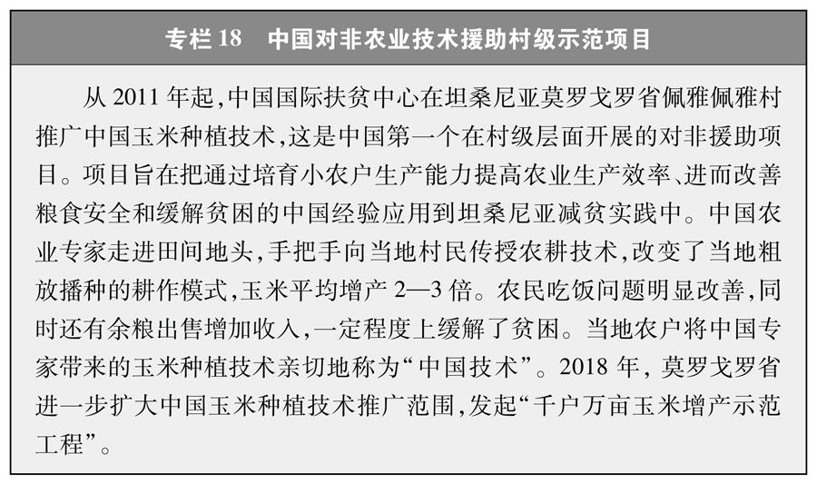實施惠及民生的國際減貧合作項目。在亞洲地區(qū),中國與東盟國家共同開展鄉(xiāng)村減貧推進計劃,在老撾、柬埔寨、緬甸三國鄉(xiāng)村基層社區(qū)實施“東亞減貧示范合作技術(shù)援助項目”(專欄17)。在非洲地區(qū),中國為非洲國家援建水利基礎(chǔ)設(shè)施、職業(yè)技術(shù)學(xué)校、社會保障住房等設(shè)施,打造農(nóng)業(yè)合作示范區(qū),推進實施中非菌草技術(shù)合作、中非友好醫(yī)院建設(shè)、非洲疾控中心總部建設(shè)等項目(專欄18)。在南太平洋地區(qū),中國推動落實對太平洋島國無償援助、優(yōu)惠貸款等舉措,開展基礎(chǔ)設(shè)施建設(shè)和農(nóng)業(yè)、醫(yī)療等技術(shù)合作援助項目。在拉美地區(qū),援建農(nóng)業(yè)技術(shù)示范中心,幫助受援國當(dāng)?shù)孛癖姅[脫貧困。中國還與聯(lián)合國教科文組織合作設(shè)立國際農(nóng)村教育研究與培訓(xùn)中心等機構(gòu),面向非洲、東南亞等國家實施農(nóng)村教育轉(zhuǎn)型、教師培訓(xùn)等項目。