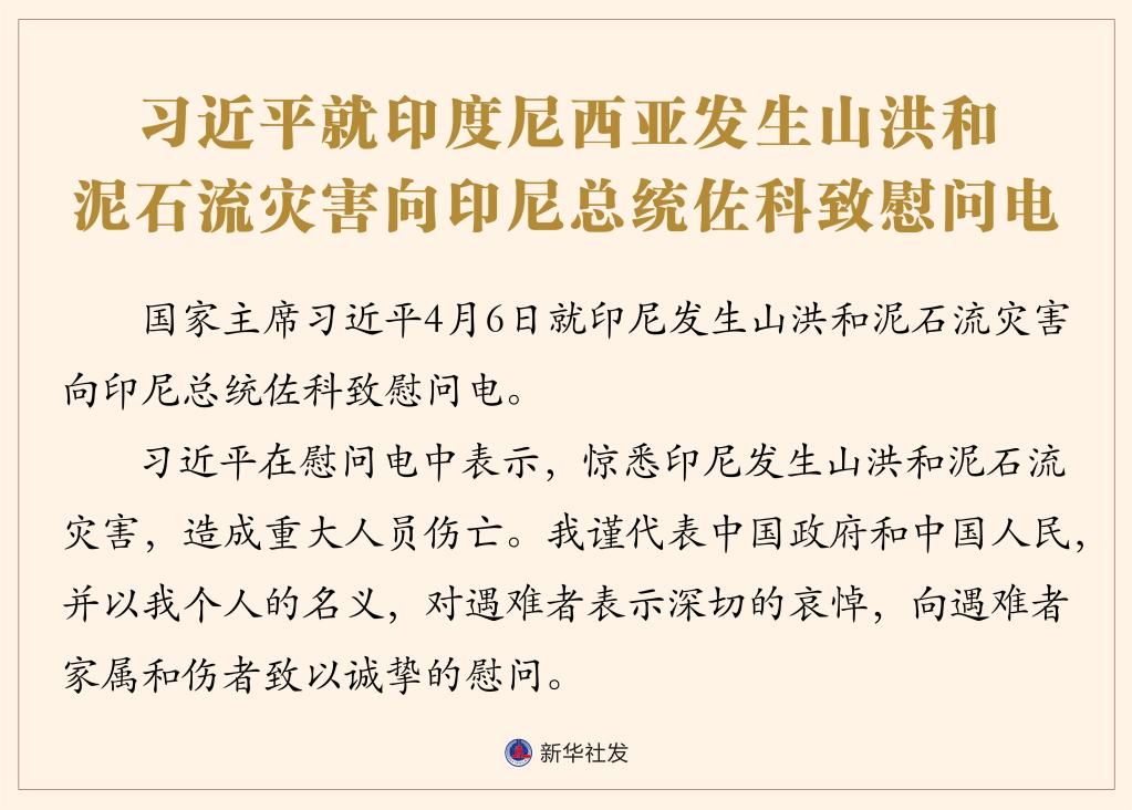 習(xí)近平在慰問(wèn)電中表示,驚悉印尼發(fā)生山洪和泥石流災(zāi)害,造成重大人員傷亡。我謹(jǐn)代表中國(guó)政府和中國(guó)人民,并以我個(gè)人的名義,對(duì)遇難者表示深切的哀悼,向遇難者家屬和傷者致以誠(chéng)摯的慰問(wèn)。