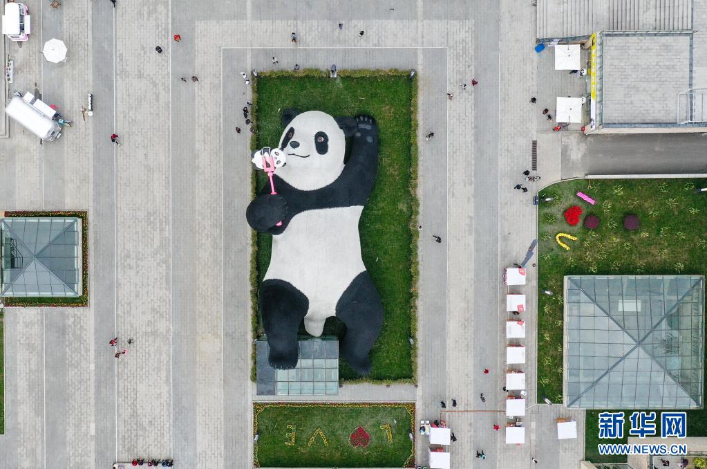 這是4月7日在四川省都江堰市仰天窩廣場(chǎng)拍攝的“自拍熊貓”雕塑(無(wú)人機(jī)照片)。