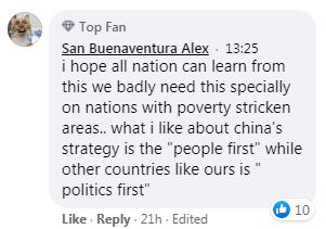 網(wǎng)友San Buenaventura Alex在臉書上留言說(shuō):“我希望全世界向中國(guó)學(xué)習(xí)減貧經(jīng)驗(yàn),特別是一些貧困的國(guó)家。我贊賞中國(guó)‘人民至上’的理念,而不是像我們國(guó)家這樣‘政治至上’!
