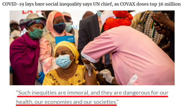 聯(lián)合國(guó)秘書(shū)長(zhǎng)古特雷斯近日發(fā)表視頻致辭再次強(qiáng)調(diào),新冠疫情危機(jī)凸顯出全球范圍內(nèi)的不平等。中低收入國(guó)家無(wú)法公平獲得疫苗違背道德,“正將我們的健康、經(jīng)濟(jì)和社會(huì)推向險(xiǎn)境”。