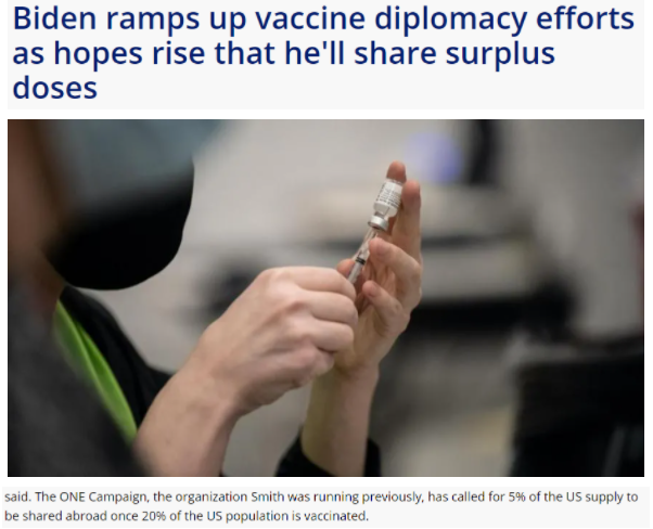 就在上個(gè)月,國(guó)際非營(yíng)利組織“ONE Campaign”稱(chēng),美國(guó)政府已經(jīng)購(gòu)買(mǎi)了4.53億劑的超量疫苗,而到目前為止,美國(guó)只向加拿大和墨西哥“借出”400萬(wàn)劑疫苗。為此,該組織敦促美國(guó)總統(tǒng)拜登在20%的美國(guó)人完全接種疫苗后,將其5%的儲(chǔ)備劑量分享給其他國(guó)家。