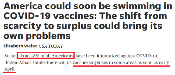 截至目前,美國(guó)已有超過(guò)6200萬(wàn)人完全接種了疫苗,約占總?cè)丝诘?8%。有專(zhuān)家認(rèn)為,美國(guó)一些地區(qū)最早在4月初就會(huì)出現(xiàn)疫苗過(guò)剩的情況。