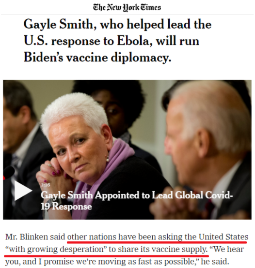 或許是在這樣一個(gè)時(shí)刻突然“良心發(fā)現(xiàn)”,一直攻擊他國(guó)搞“疫苗外交”的美國(guó)居然自己也要搞了:當(dāng)?shù)貢r(shí)間5日,美國(guó)國(guó)務(wù)院任命公共衛(wèi)生專(zhuān)家蓋爾·史密斯為“全球新冠疫情應(yīng)對(duì)及衛(wèi)生安全協(xié)調(diào)員”,就新冠疫苗展開(kāi)外交工作。