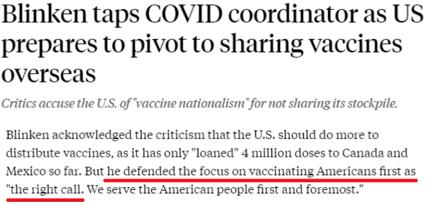 在公開(kāi)表示要搞“疫苗外交”之前,美國(guó)給世人留下的最大印象恐怕就是“疫苗民族主義”了。
