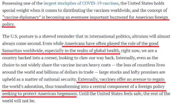 美國(guó)《塔夫茨日?qǐng)?bào)》評(píng)論稱(chēng),“疫苗外交”正日益成為美國(guó)外交政策中的一個(gè)時(shí)髦術(shù)語(yǔ)。美國(guó)熱衷在世界衛(wèi)生領(lǐng)域扮演樂(lè)善好施的角色,并試圖通過(guò)“疫苗外交”重獲世界崇拜。但歸根結(jié)底,“只有美國(guó)覺(jué)得自己安全了,世界才會(huì)安全”。
