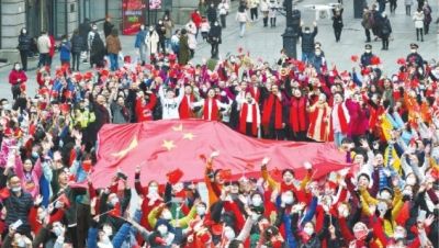 在江漢路步行街,“春歸英雄城 禮贊中國年”快閃活動現(xiàn)場,藝術(shù)家和市民手舉五星紅旗高唱《我愛你中國》。