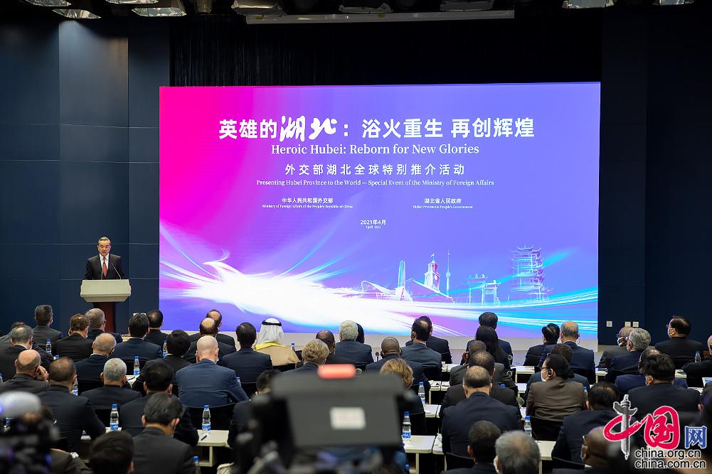 中國(guó)網(wǎng)4月12日訊 (記者 楊佳 孫宇)2021年4月12日,以“英雄的湖北:浴火重生,再創(chuàng)輝煌”為主題的外交部湖北全球特別推介活動(dòng)在外交部藍(lán)廳舉行,國(guó)務(wù)委員兼外長(zhǎng)王毅發(fā)表致辭,湖北省委書記應(yīng)勇、武漢市委書記王忠林進(jìn)行推介。湖北省省長(zhǎng)王曉東,外交部黨委書記齊玉、副部長(zhǎng)樂(lè)玉成等外交部領(lǐng)導(dǎo)以及外國(guó)駐華使節(jié)、國(guó)際組織駐華代表、中外工商界人士、媒體記者約500人出席。