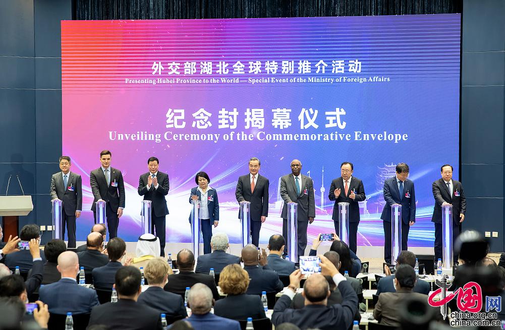 王毅國(guó)務(wù)委員和湖北省主要領(lǐng)導(dǎo)及外國(guó)駐華使節(jié)代表等還共同為湖北全球特別推介活動(dòng)特制外交紀(jì)念封揭幕。中國(guó)網(wǎng) 楊佳 攝影