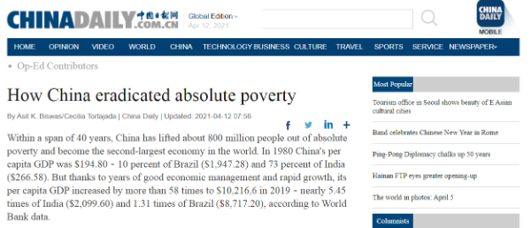 近日,英國格拉斯哥大學(xué)杰出訪問教授阿西特 比斯瓦斯(Asit K. Biswas)、跨學(xué)科研究學(xué)院教授塞西莉亞 托塔哈達(dá)(Cecilia Tortajada)在《中國日報(bào)》發(fā)表文章總結(jié)了中國脫貧奇跡的六大密碼,認(rèn)為堅(jiān)強(qiáng)領(lǐng)導(dǎo)是中國減貧“密碼”的關(guān)鍵所在。