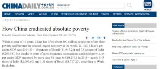 近日,英國(guó)格拉斯哥大學(xué)杰出訪問(wèn)教授阿西特 比斯瓦斯(Asit K. Biswas)、跨學(xué)科研究學(xué)院教授塞西莉亞 托塔哈達(dá)(Cecilia Tortajada)在《中國(guó)日?qǐng)?bào)》發(fā)表文章總結(jié)了中國(guó)脫貧奇跡的六大密碼,認(rèn)為堅(jiān)強(qiáng)領(lǐng)導(dǎo)是中國(guó)減貧“密碼”的關(guān)鍵所在。