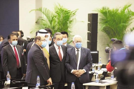活動現(xiàn)場,外賓同國務(wù)委員兼外長王毅(中)合影。