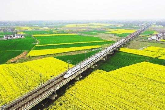 一列高鐵穿過天門市麻陽鎮(zhèn)的油菜花海和麥田。(湖北日報全媒記者 陳勇 攝)