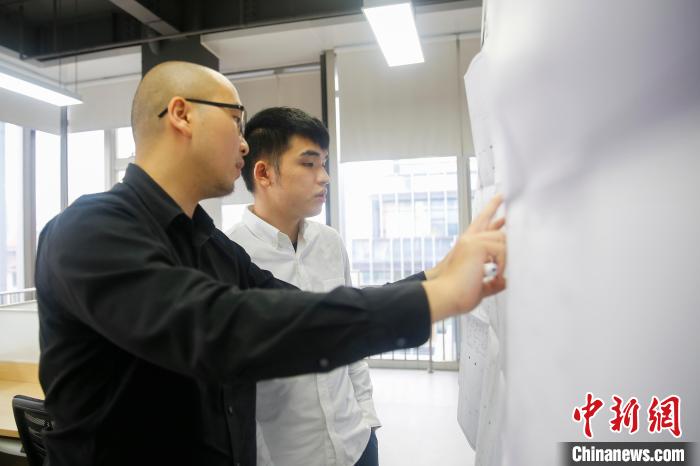 圖為澳門青年設(shè)計(jì)師蔡敏德(左)、龔浩賜在位于珠海橫琴的辦公室內(nèi)研究建筑圖紙。 王駿 攝