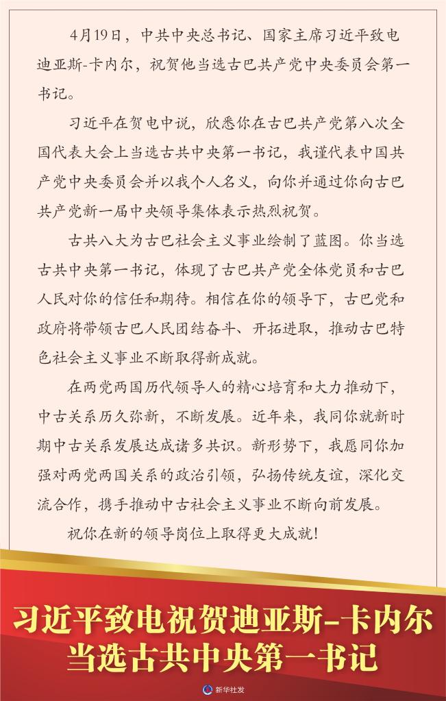 新華社北京4月20日電 4月19日,中共中央總書記、國(guó)家主席習(xí)近平致電迪亞斯-卡內(nèi)爾,祝賀他當(dāng)選古巴共產(chǎn)黨中央委員會(huì)第一書記。