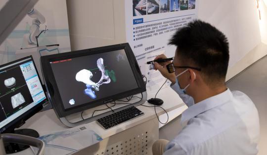 一名參觀者正在體驗(yàn)VR手術(shù)規(guī)劃系統(tǒng)。該系統(tǒng)可在虛擬現(xiàn)實(shí)環(huán)境下重建病灶部位的3D仿真模型,輔助外科醫(yī)生制定手術(shù)方案。人民日?qǐng)?bào)記者 朱笑熺、朱瑛琪攝