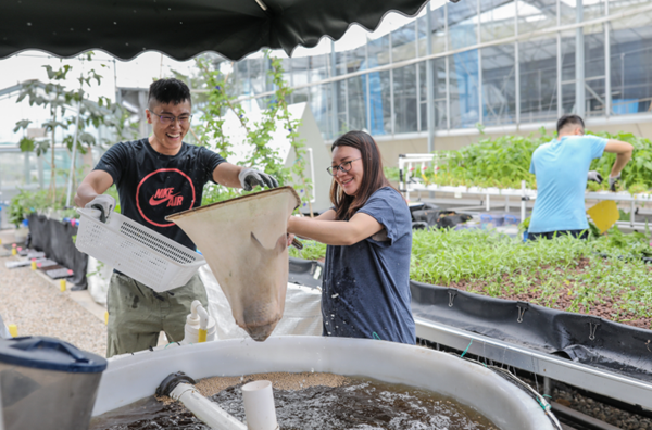 “養(yǎng)魚不換水,種菜不施肥,這就是我們開發(fā)的‘魚菜共生’系統(tǒng),其本質(zhì)是一個(gè)循環(huán)農(nóng)業(yè)項(xiàng)目”。香港青年梁立峰是項(xiàng)目的創(chuàng)始人之一,他告訴記者,“魚菜共生”的原理是在溫室內(nèi)通過水處理系統(tǒng),將集約式養(yǎng)魚所產(chǎn)生的富營(yíng)養(yǎng)水體,轉(zhuǎn)化成為蔬菜可以吸收的營(yíng)養(yǎng),從而種植有機(jī)水培蔬菜。“所有的蔬菜都是零農(nóng)殘,因?yàn)橐坏┦┝宿r(nóng)藥和化肥,魚兒就死了,”梁立峰說。