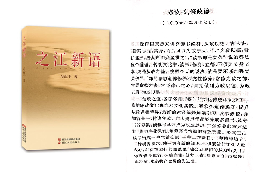 2006年2月17日,時(shí)任浙江省委書(shū)記的習(xí)近平用筆名“哲欣”在《浙江日?qǐng)?bào)》“之江新語(yǔ)”專欄發(fā)表題為《多讀書(shū),修政德》的文章。他說(shuō),我們國(guó)家歷來(lái)講究讀書(shū)修身、從政以德。廣大黨員干部要養(yǎng)成多讀書(shū)、讀好書(shū)的習(xí)慣,使讀書(shū)學(xué)習(xí)成為改造思想、加強(qiáng)修養(yǎng)的重要途徑,成為凈化靈魂、培養(yǎng)高尚情操的有效手段。