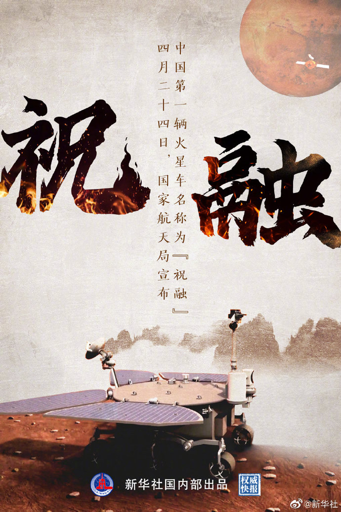 4月24日上午,中國第一輛火星車命名揭曉,名稱為“祝融”。祝融是中國上古神話中的火神,火的應(yīng)用促進(jìn)了人類文明的發(fā)展,驅(qū)散黑暗、帶來溫暖;鹨矊⒄樟柳櫭,指引人類不斷探索浩瀚星空,引領(lǐng)人類追逐“永遠(yuǎn)的光明”。