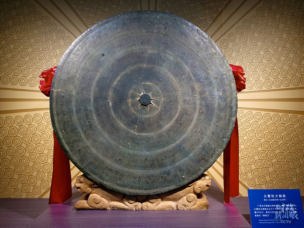 △陳列在廣西民族博物館的“銅鼓王”——云雷紋大銅鼓,面徑165厘米,重299公斤,是迄今發(fā)現(xiàn)世界上最大的古代銅鼓。(總臺(tái)央廣記者潘毅拍攝)