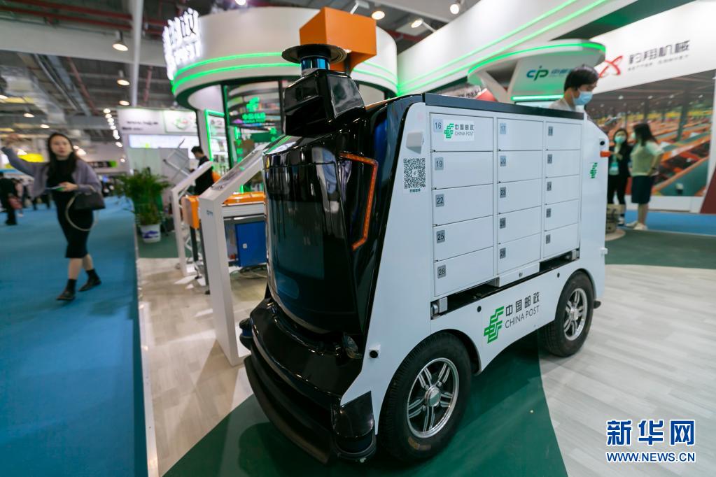 4月27日在中國郵政展區(qū)前拍攝的無人投遞車,無人投遞車主要應(yīng)用于小區(qū)、園區(qū)、校園等封閉和半封閉的場景。