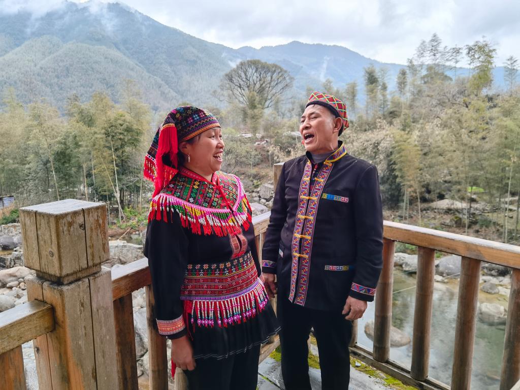鄧鳳志(右)與愛人對唱瑤族傳統(tǒng)山歌。(新華社記者盧羨婷2021年2月9日攝)