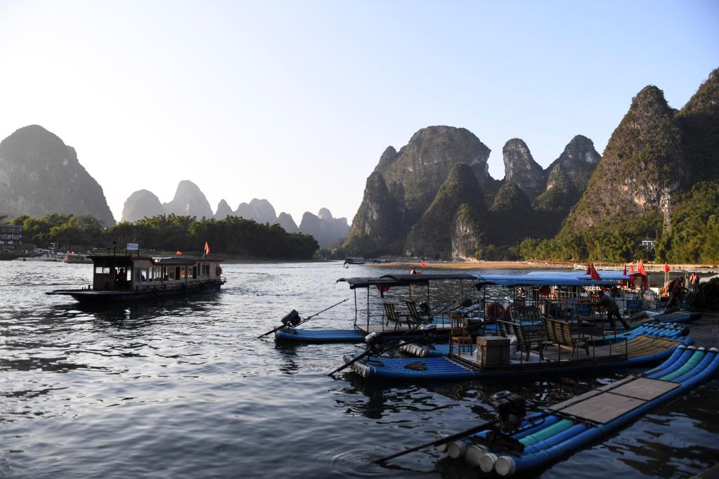 陽朔縣興坪鎮(zhèn)漓江上的渡船和觀光竹筏。(新華社記者曹祎銘2019年11月19日攝)