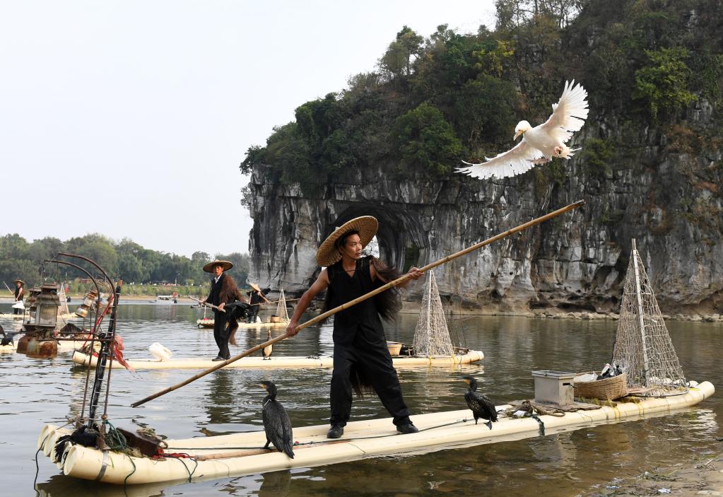 在桂林市象山景區(qū),“漁夫”為游客表演魚鷹捕魚。(新華社記者陸波岸2017年10月24日攝)