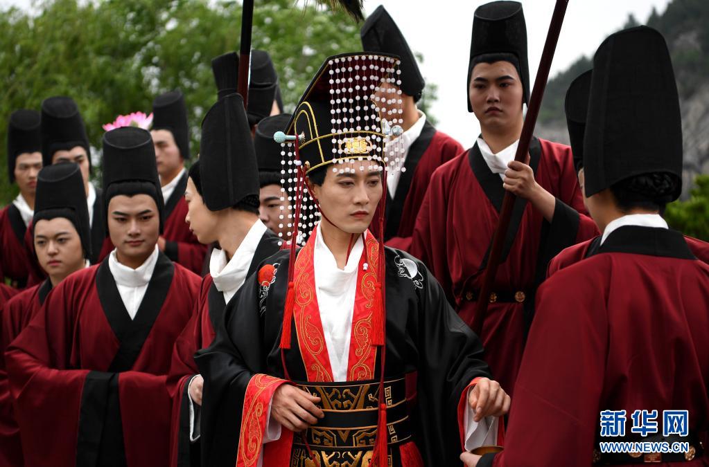 演員在洛陽龍門石窟景區(qū)禮佛臺演繹《魏孝文帝禮佛圖》(4月25日攝)。新華社記者李安攝