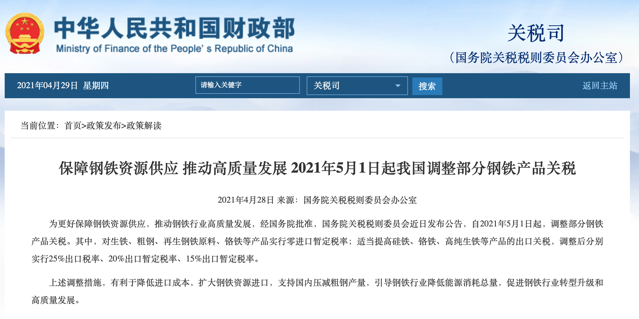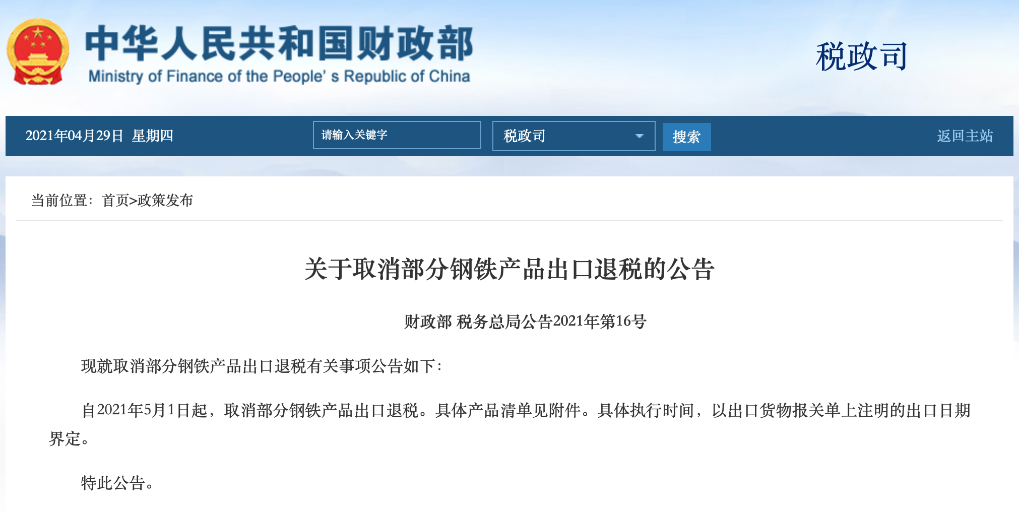 財(cái)政部、國(guó)家稅務(wù)總局聯(lián)合發(fā)布公告:自2021年5月1日起取消部分鋼鐵產(chǎn)品出口退稅