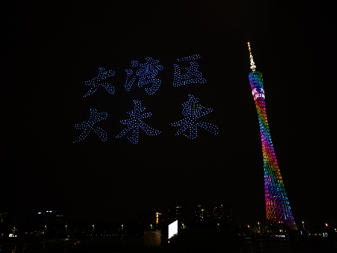 4月19日晚,廣州海心沙的無人機(jī)天幕光影表演。圖為1000架無人機(jī)組成“大灣區(qū)大未來”文字圖案。人民日報(bào)記者 張武軍攝