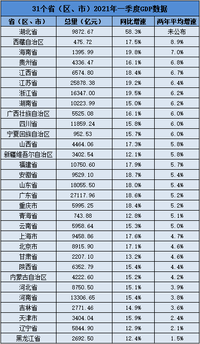 從兩年平均增速來看,西藏自治區(qū)、海南、貴州、江西、江蘇、浙江、湖南、廣西壯族自治區(qū)、四川、寧夏回族自治區(qū)十個。▍^(qū))的增速均達到了6%及以上。國家統(tǒng)計局公布的數據顯示,一季度中國GDP兩年平均增長5%,而 19個。▍^(qū)、市)達到或超過了這一平均水平。