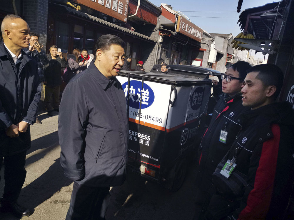 ↑2019年2月1日,習(xí)近平在北京看望慰問(wèn)基層干部群眾,考察北京冬奧會(huì)、冬殘奧會(huì)籌辦工作。這是習(xí)近平在結(jié)束前門(mén)東區(qū)看望慰問(wèn)乘車(chē)返回途中,臨時(shí)下車(chē)來(lái)到前門(mén)石頭胡同的快遞服務(wù)點(diǎn),看望仍在工作的“快遞小哥”。