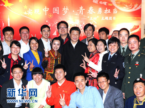 2013年5月4日,中共中央總書記、國(guó)家主席、中央軍委主席習(xí)近平來(lái)到中國(guó)航天科技集團(tuán)公司中國(guó)空間技術(shù)研究院,同各界優(yōu)秀青年代表座談并發(fā)表重要講話。這是座談會(huì)前,習(xí)近平和在展廳參觀的優(yōu)秀青年代表合影。新華社記者 饒愛(ài)民 攝
