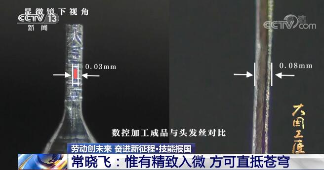 央視網(wǎng)消息:每一個細(xì)節(jié)都是對勞動技能的生動總結(jié),每一份堅守都孕育著偉大的創(chuàng)造。用比頭發(fā)絲還細(xì)0.05毫米的刻刀刀頭在直徑0.15毫米的金屬絲上刻字,這相當(dāng)于用繡花針給螞蟻腿做縫合。數(shù)控微雕就需要擁有這樣超高技藝的人, 這項技術(shù)常用于我國航空航天精密零部件的加工制造,需要高超的數(shù)控技術(shù)水平。在前不久舉行的全國第一屆職業(yè)技能大賽中,這項考驗“眼力”和“手力”的技術(shù)在近200個參賽作品中得了“最受歡迎的中華十大絕技”,而掌握這項絕技的就是來自中國航天科工二院283廠的高級技師常曉飛。