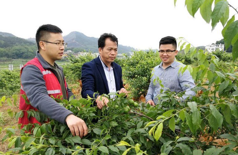 △廣西馬山縣林圩鎮(zhèn)伏興村駐村第一書(shū)記周福波(左一)在查看村里已經(jīng)掛果的三華李。