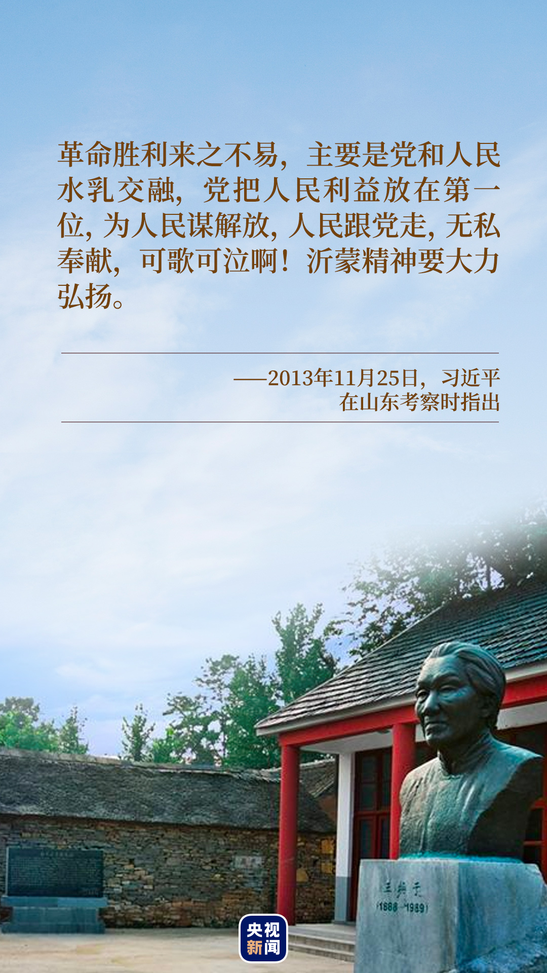 “在沂蒙這片紅色土地上,誕生了無(wú)數(shù)可歌可泣的英雄兒女,沂蒙六姐妹、沂蒙母親、沂蒙紅嫂的事跡十分感人!绷(xí)近平總書記深情地說(shuō)。2013年11月25日,習(xí)近平在視察山東沂蒙革命老區(qū)臨沂期間,專程前往華東革命烈士陵園,向革命烈士紀(jì)念塔敬獻(xiàn)花籃并參觀沂蒙精神展。