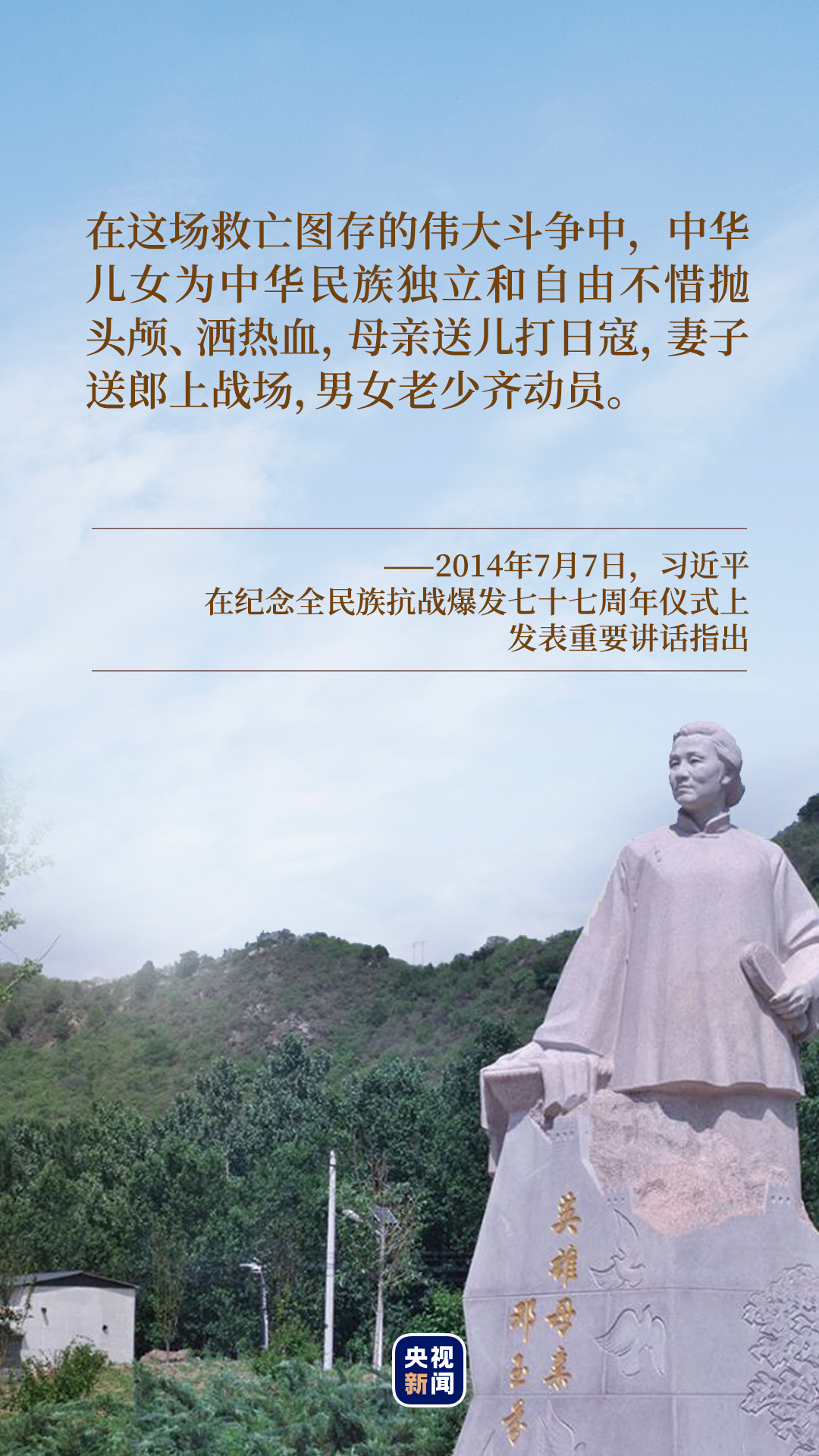 “北京密云縣一位名叫鄧玉芬的母親,把丈夫和5個(gè)孩子送上前線,他們?nèi)繎?zhàn)死沙場(chǎng)。”2014年7月7日,在出席紀(jì)念全民族抗戰(zhàn)爆發(fā)七十七周年儀式并發(fā)表重要講話時(shí),習(xí)近平總書記講述了英雄母親鄧玉芬的故事。