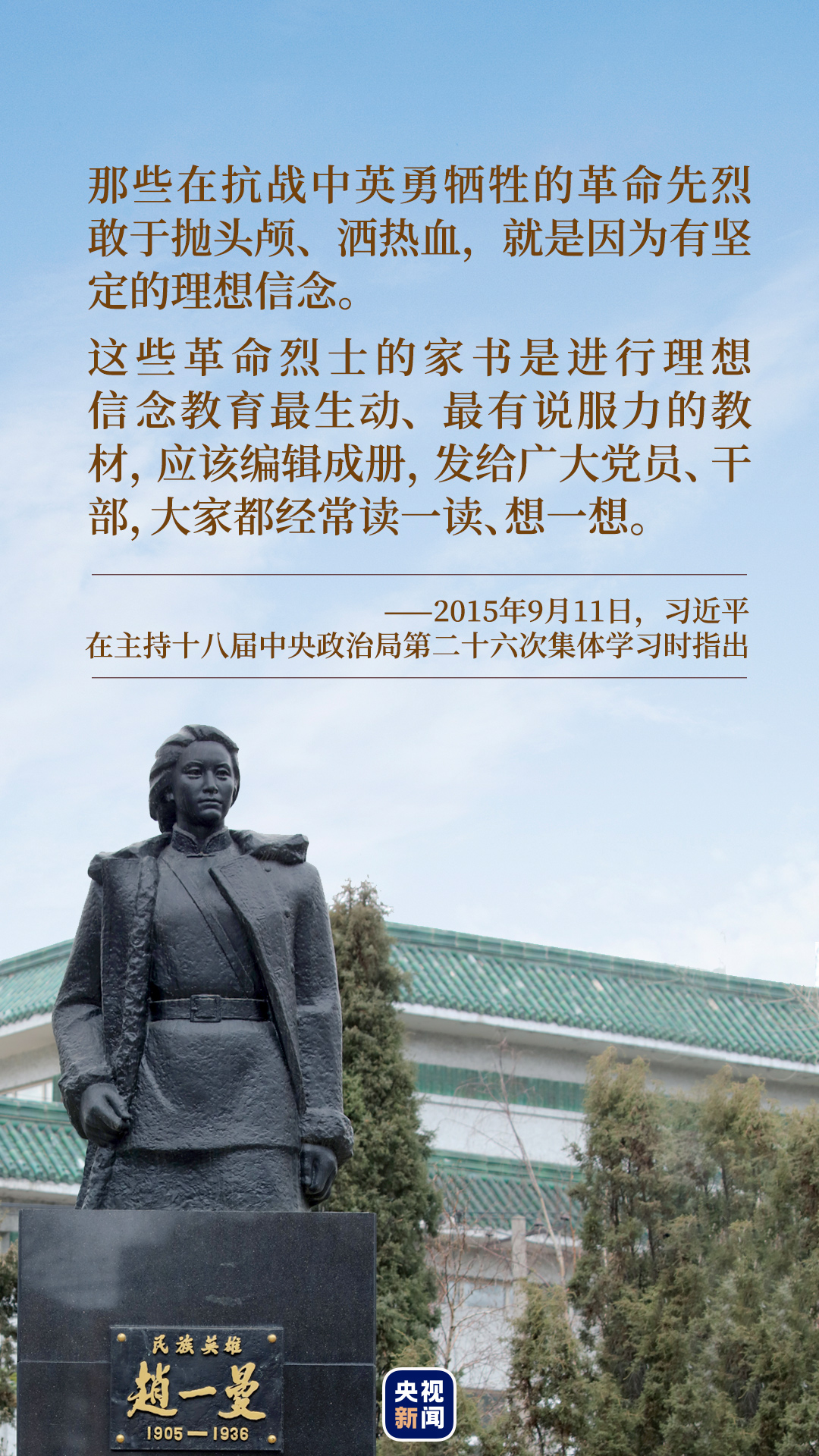 “趙一曼在臨死前的遺書中寫道:‘母親因?yàn)閳?jiān)決地做了反滿抗日的斗爭(zhēng),今天已經(jīng)到了犧牲的前夕了。母親和你在生前是永久沒有再見的機(jī)會(huì)了……我最親愛的孩子!母親不用千言萬(wàn)語(yǔ)來(lái)教育你,就用實(shí)行來(lái)教育你。在你長(zhǎng)大成人之后,希望你不要忘記你的母親是為國(guó)而犧牲的……母親死后,我的孩子要代替母親繼續(xù)斗爭(zhēng),自己壯大成長(zhǎng),來(lái)安慰九泉之下的母親!’”一字一句,總書記飽含深情。