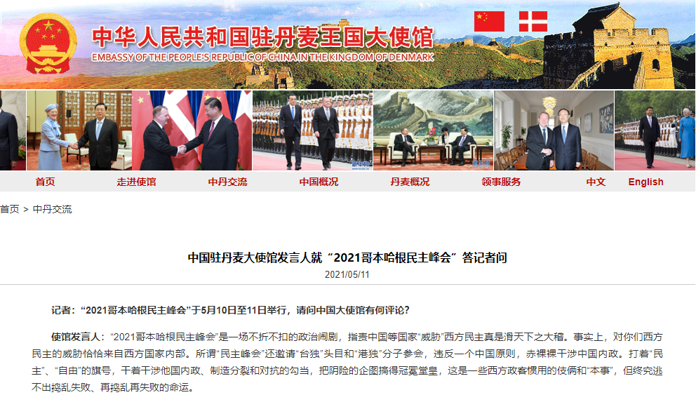 中國(guó)駐丹麥大使館官方網(wǎng)站消息:有記者提問(wèn),“2021哥本哈根民主峰會(huì)”于5月10日至11日舉行,請(qǐng)問(wèn)中國(guó)大使館有何評(píng)論?