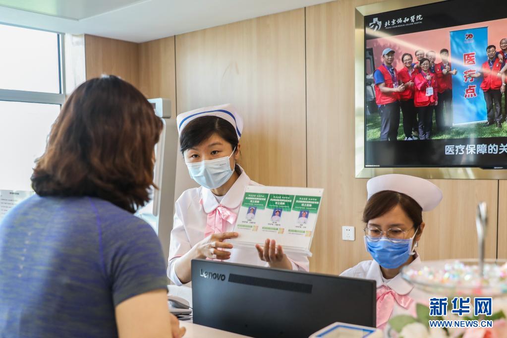5月11日,北京協(xié)和醫(yī)院南丁格爾護理志愿服務隊成員為一名活動參加者提供分診咨詢。