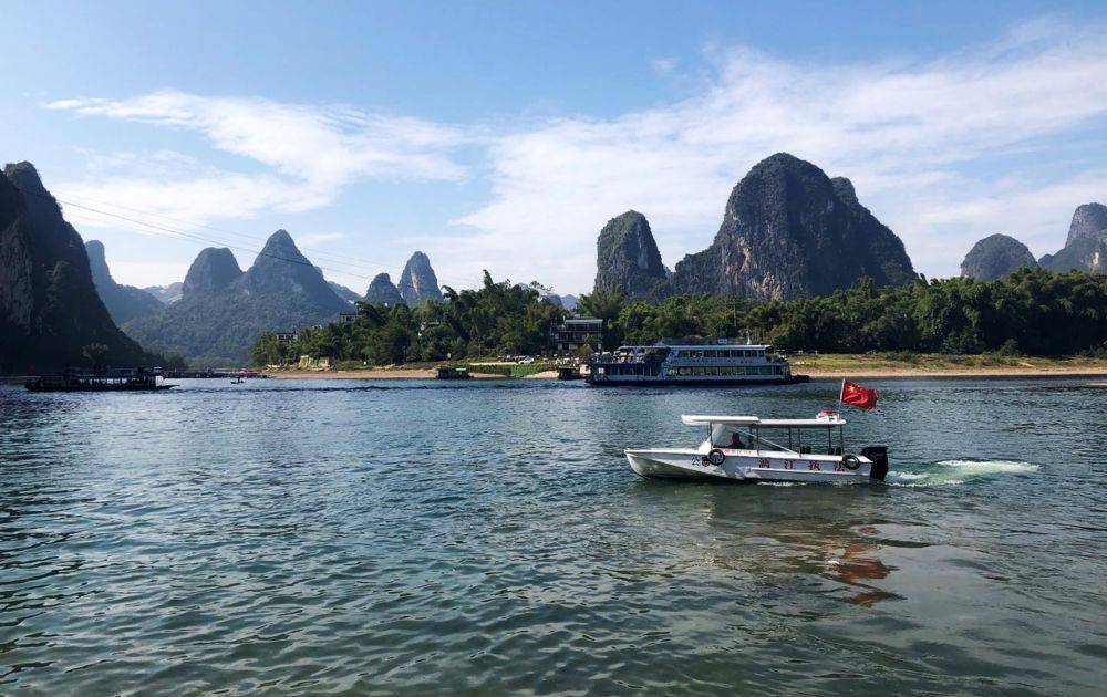 ↑執(zhí)法船在漓江上巡查(2019年11月14日攝)。